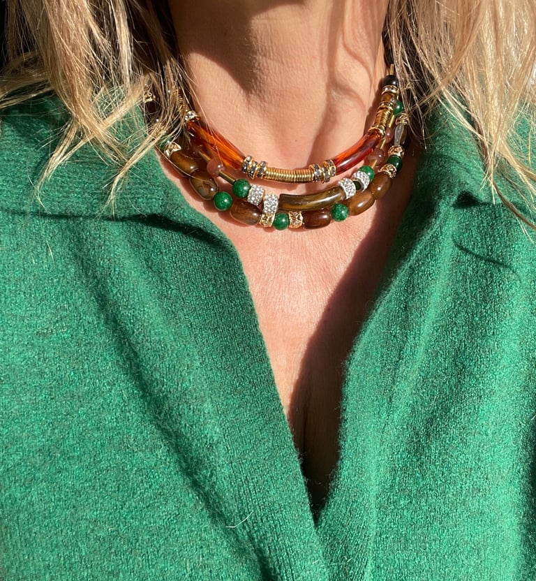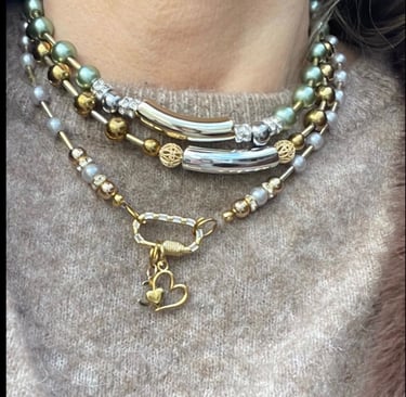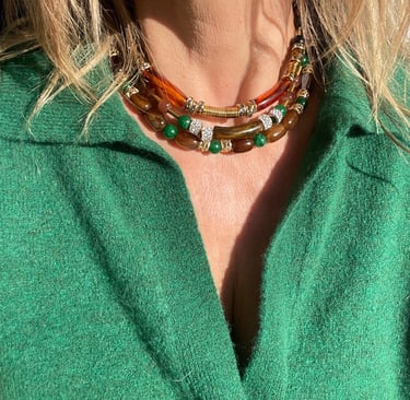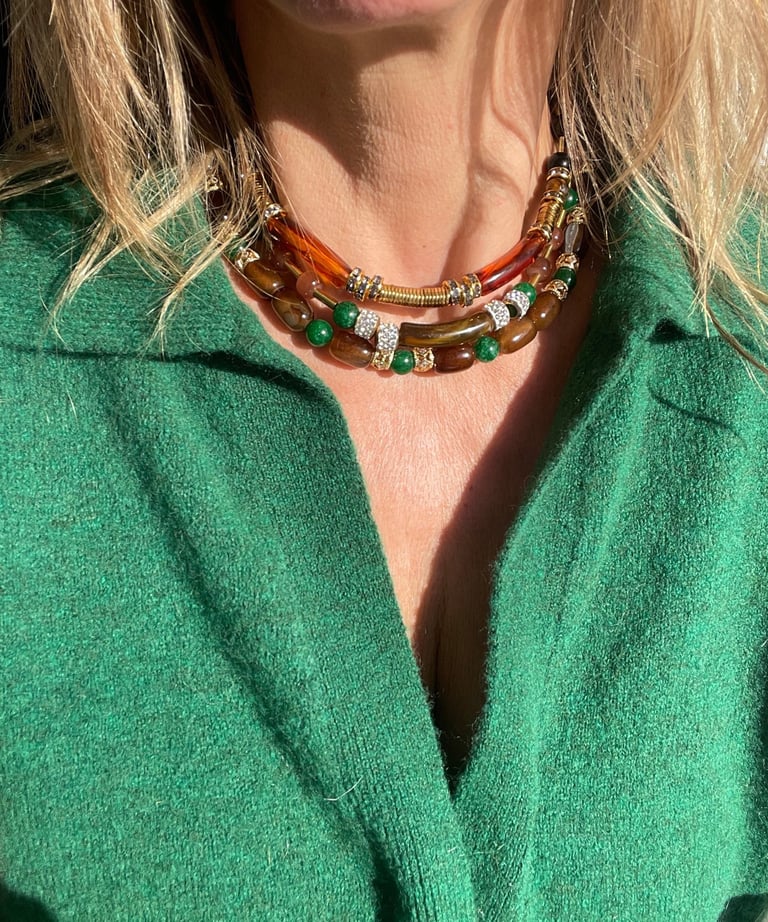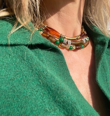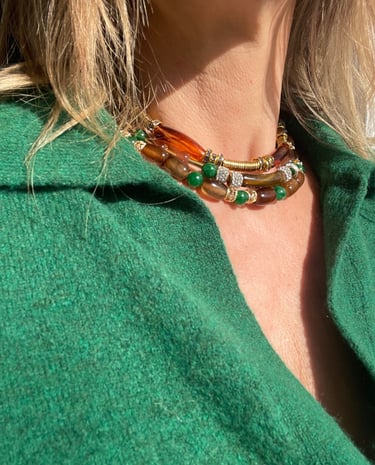 Chaque collier, bracelet et bijou est assemblé à la main avec des pierres naturelles, des finitions plaqué or et une attention particulière portée aux détails.